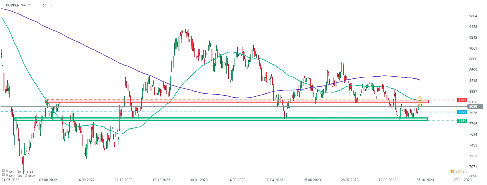 A réz a múlt héten a 7.850 dolláros területről visszapattant, és a kínai gazdaságélénkítési remények hatására visszatért a 8.000 dolláros szint fölé. A 8.200 dolláros ellenállási zóna feletti áttörési kísérlet azonban kudarcot vallott, és a tegnapi gyertyatartó hosszú felső kanóca arra utal, hogy a területen erős medvetábor van. Forrás: xStation5