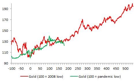 Feltételezve, hogy az arany a 2008–2011-es időszakhoz hasonlóan viselkedik, még mindig sok tér áll rendelkezésre a további árnövekedésre. Forrás: Bloomberg, XTB