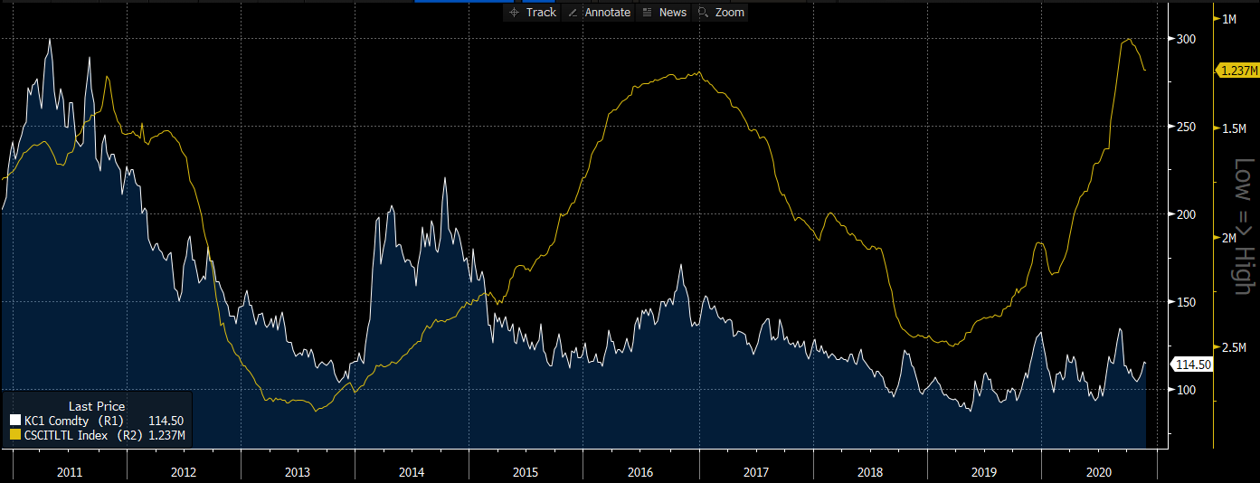 A kávékészletek folyamatosan növekszenek (fordított tengely). Ennek ellenére a brazíliai kávékészletek kompenzálhatják a közelmúltbeli hiányokat és nyomást gyakorolhatnak a kávéárakra is. Forrás: Bloomberg