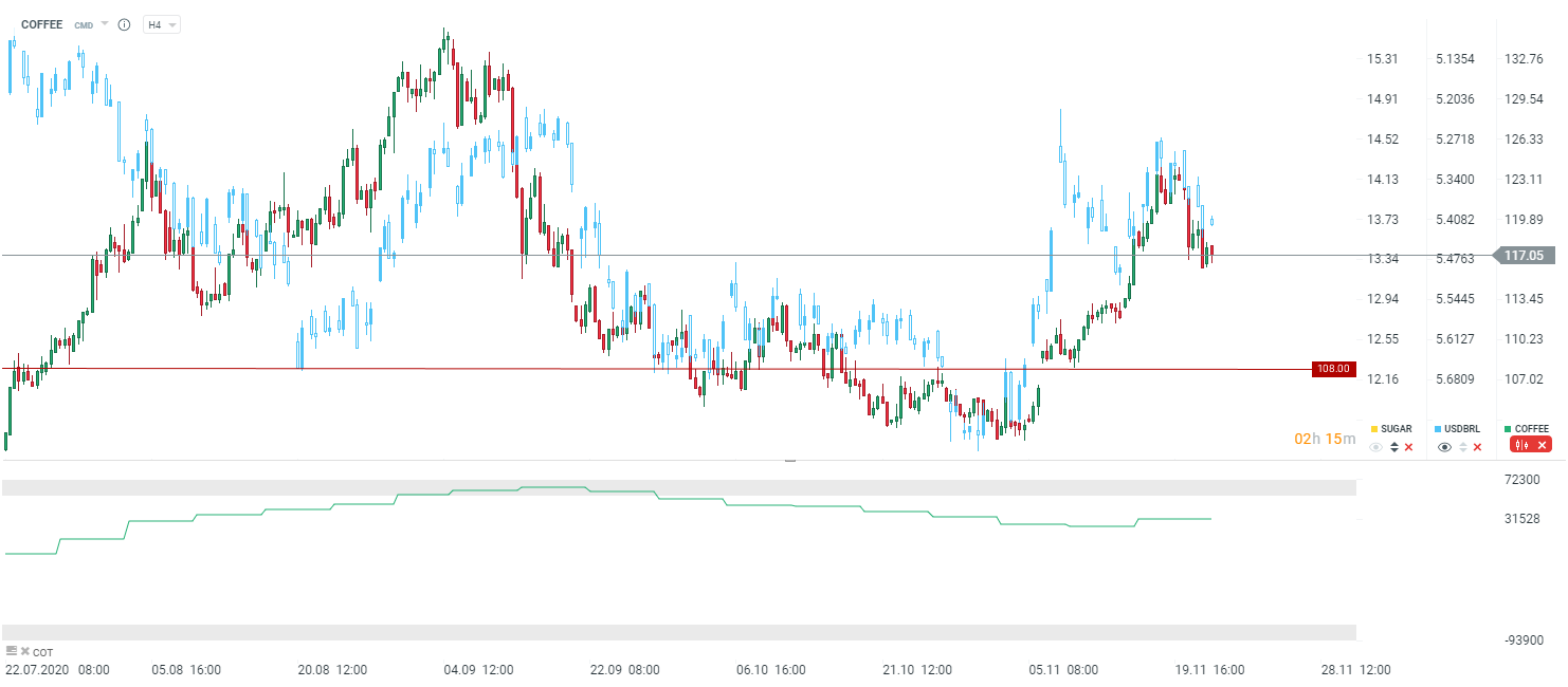 A kávé ára a közelmúltban csökken a jobb időjárási viszonyok és a negatív alapok miatt. A brazil real is gyengült. Forrás: xStation 5