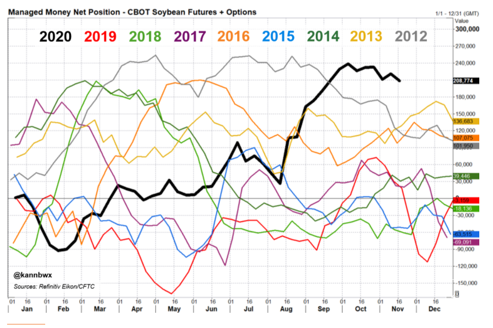 Rendkívüli pozicionálás a szójapiacon. Míg az alapvető kilátások pozitívak, az ilyen rendkívül magas pozicionálás hatalmas profitcsökkenést válthat ki a profitfelvétel révén. Forrás: Reuters