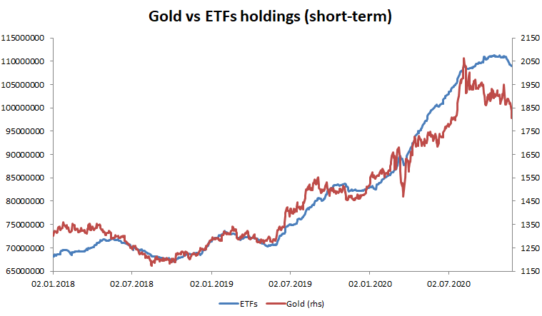 Az ETF-ek aranyat árulnak. Az ilyen helyzet a részvények, különösen a "régi gazdaság" részvények iránti megnövekedett kereslethez köthető. Forrás: Bloomberg, XTB