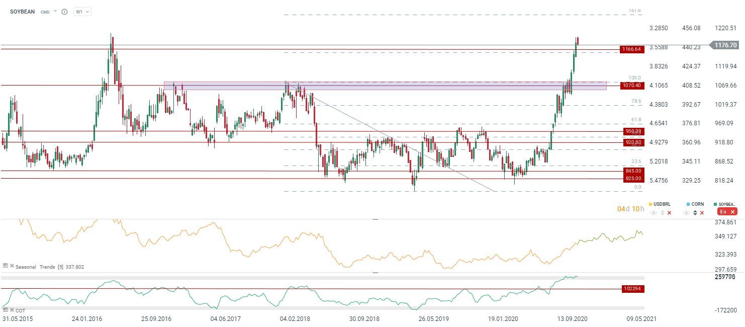 A szójabab 2016 óta a legmagasabb szinten kereskedik, de a szezonális minták a felfelé irányuló lépés folytatására utalnak. A pozicionálás rendkívül magas. Forrás: xStation5