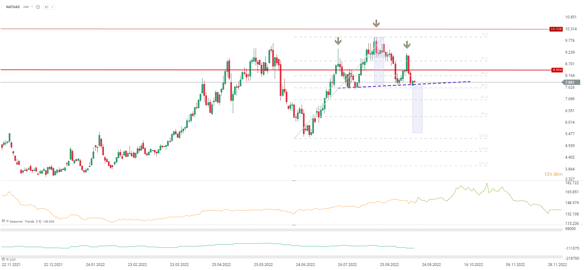 US natural gas prices (NATGAS) bounced off the neckline of a head and shoulders pattern. Seasonal patterns point to a period of range trading over the next 2 weeks. Source: xStation5