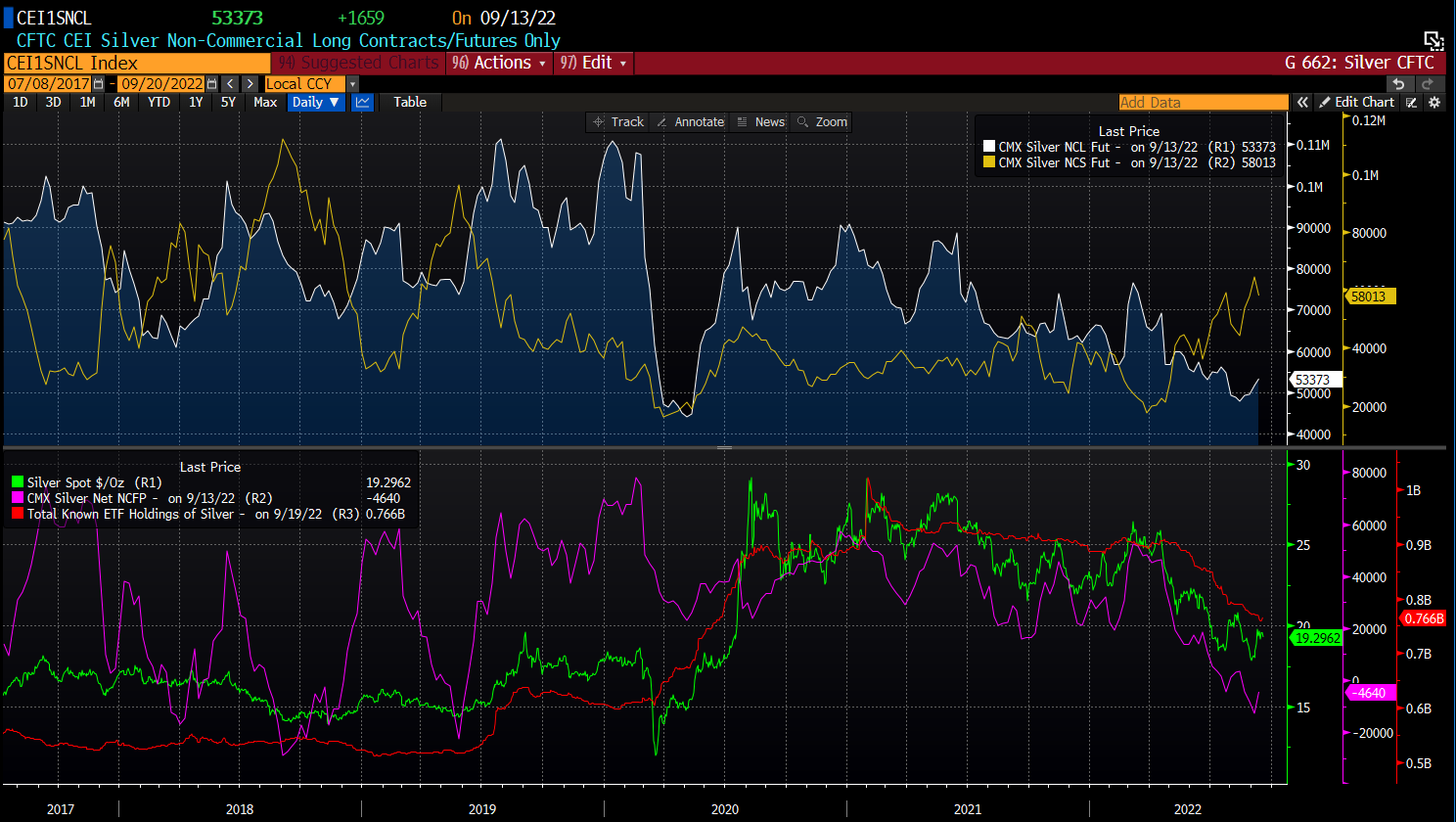 Speculative demand for silver remains weak, with net positioning sitting near extreme lows. Source: Bloomberg