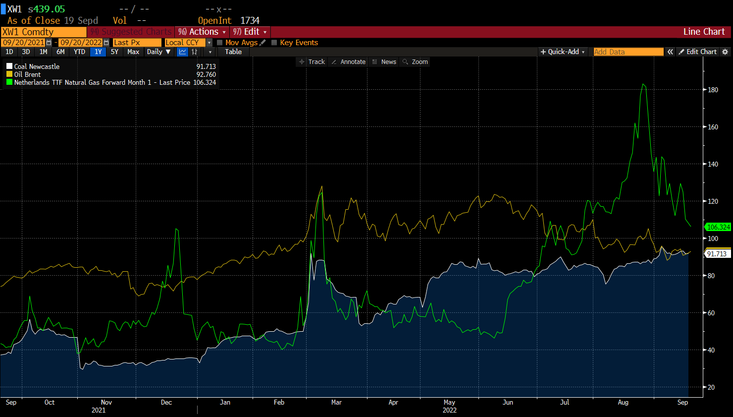 Price of coal for deliveries to Newcastle port jumped above oil prices. Meanwhile, gas prices, expressed as a barrel of oil equivalent, dropped to around $100. Source: Bloomberg