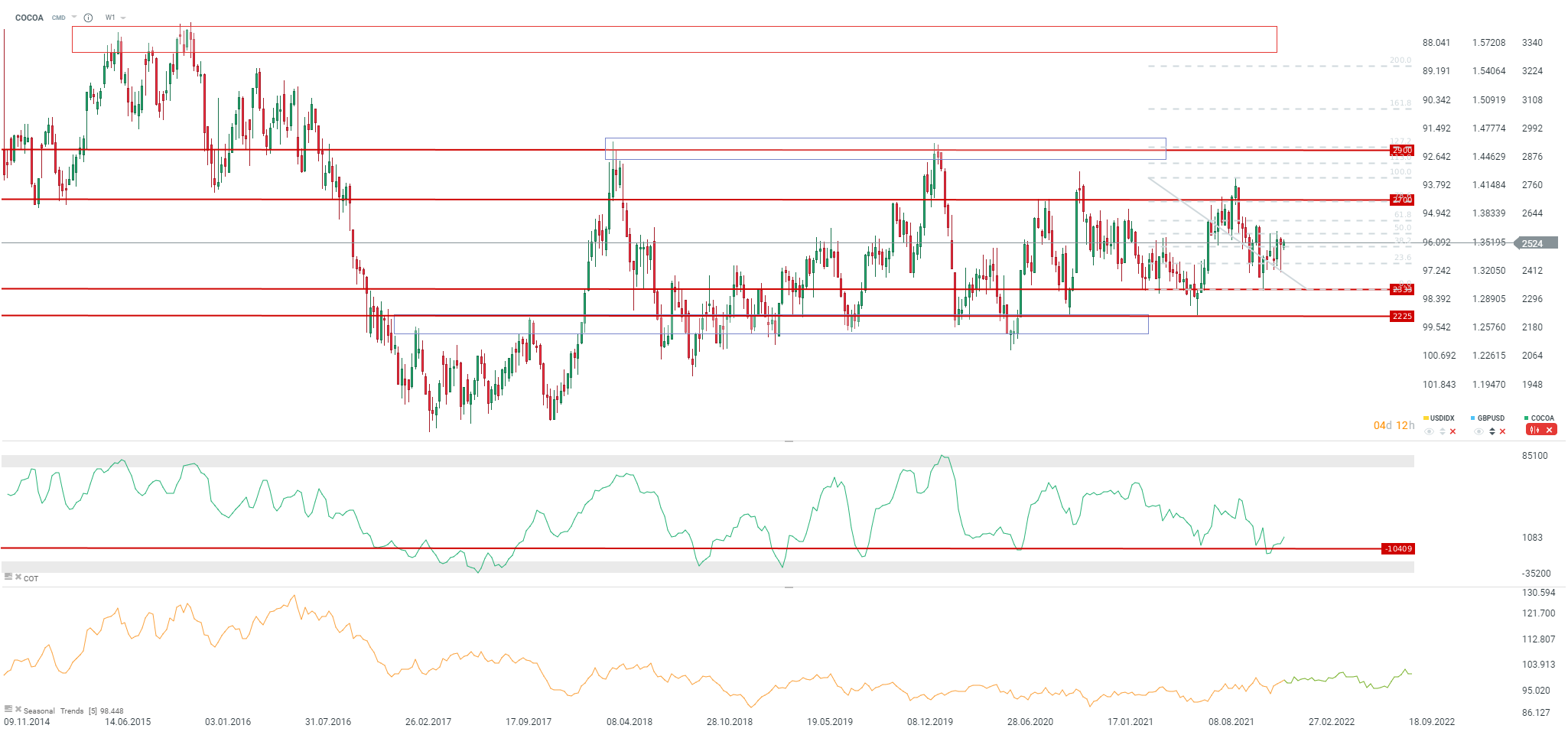 Cocoa price has been trading in a wide range since 2018 and in a narrower range since the end of 2020. It should be noted that speculative positioning is rebounding from a very low level, what used to be followed by price recovery in the past. Source: Bloomberg