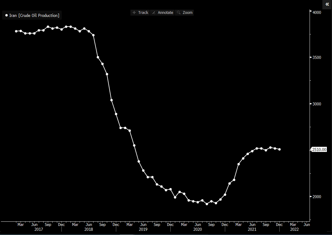 Iranian oil production has been stable in recent months and around 1.5 million barrels lower compared to the period when the nuclear accord was in effect. Source: Bloomberg