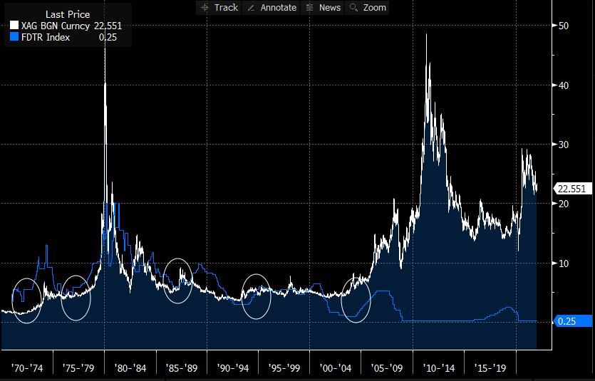 Silver used to gain during US rate hike cycles. However, gains usually started from much lower price levels than now. Source: Bloomberg