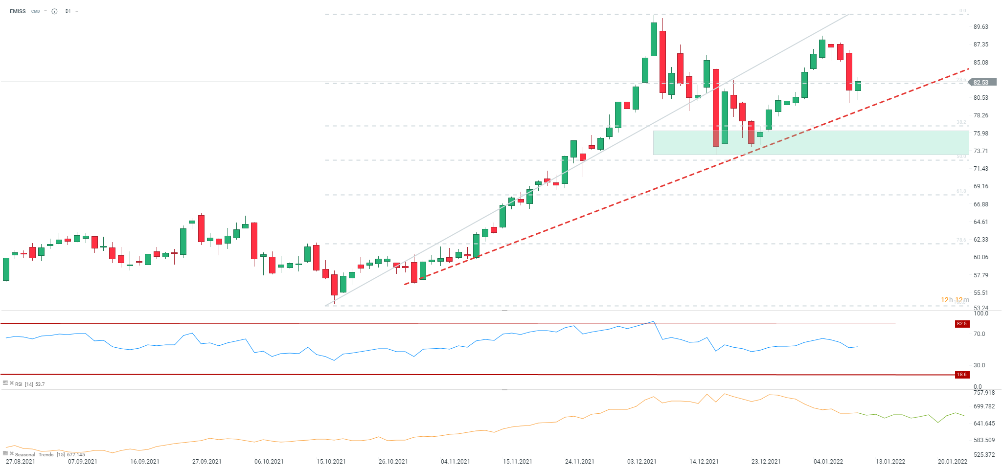 Forecasts point to an average EMISS price of €100 per contract in 2022. However, should natural gas prices drop and weather gets warmer, a price correction towards the €70-75 area cannot be ruled out. Source: xStation5