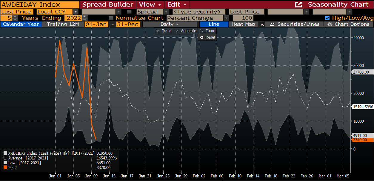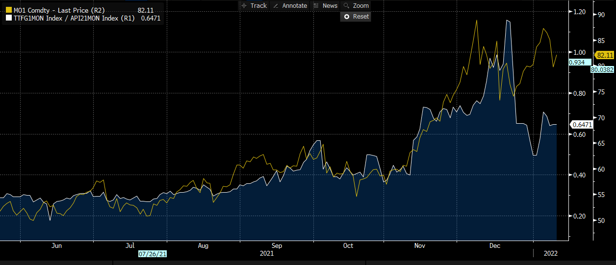 Natural gas prices in Europe dropped but remain at elevated levels. Ratio of natural gas to coal price is also much lower than it used to be in December, suggesting that emission contracts should trade in the €70-75 range. Nevertheless even the latest rebound in coal prices may not derail the uptrend on emissions contracts as natural gas inventories will drop more steeply amid colder weather. Source: Bloomberg