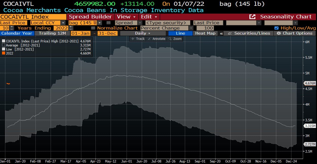 Cocoa inventories at the beginning of a new year sit at the highest level in 10-year for the period. However, inventories were dropping at the end of the previous year