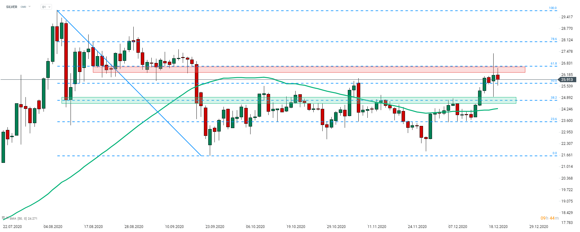 Rally on the silver market stalled following a failed attempt of breaking above the resistance zone marked by 61.8% retracement of the August-September correction. Precious metal gave back gains made on the back of yesterday's virus panic and has turned lower on the back of USD strengthening. However, bears struggle to push the price back below the 50% retracement ($25.75). Source: xStation5