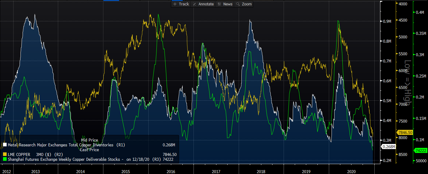 Copper stockpiles on the global exchanges continue to fall signalling that fundamentals behind a recent rally remain in place. Source: Bloomberg
