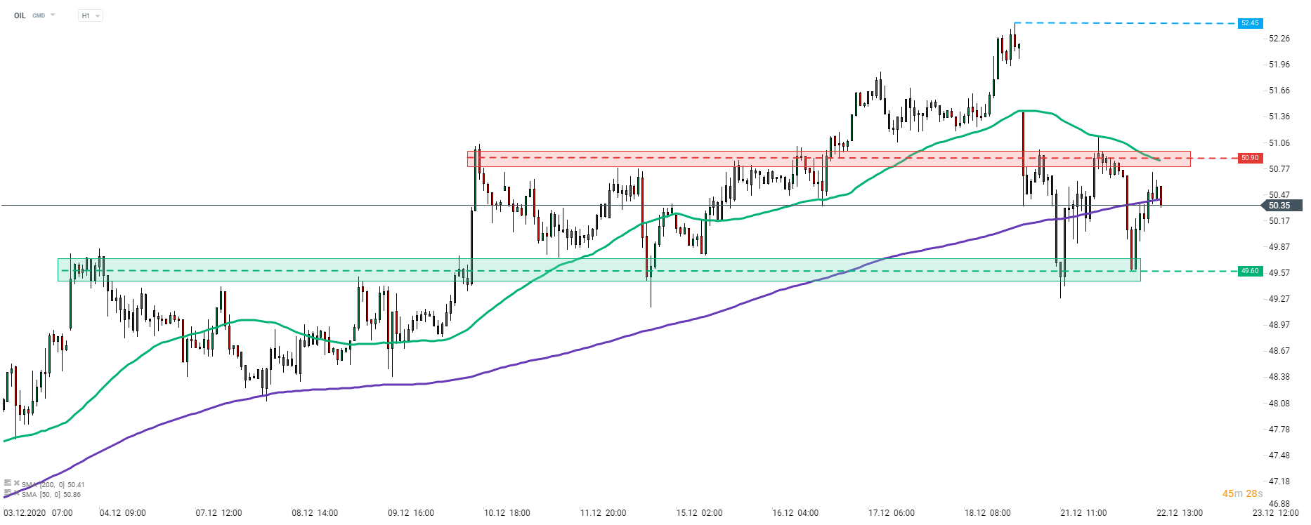 Oil price took a hit over fears that new strain of coronavirus may result in longer and stricter lockdowns. Brent has formed a double bottom in the $49.60 area. Breaking above the zone at $50.90 could hint at pattern being in play and may herald a return towards a post-pandemic high at $52.45. Source: xStation5