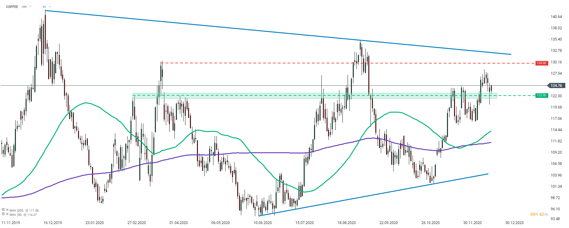 Coffee continues to trade in a wide wedge pattern. Price has pulled back recently but a support was found at the zone ranging around 122.50. Long, lower wick of yesterday's daily candlestick hints at a strong bullish bias in the market. Should rebound extend beyond today, traders should focus on the psychological 130 area. Source: xStation5