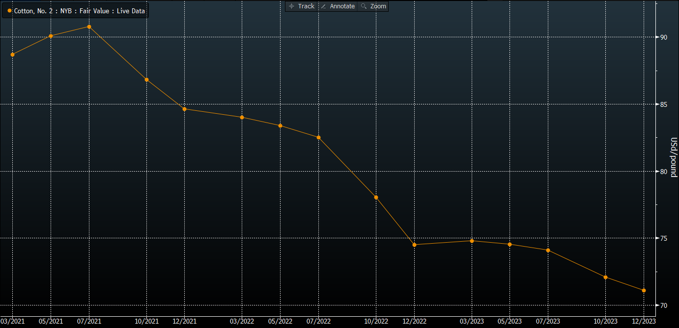 The price recorded a slight semi-contango. Later, the market expects lower prices. The market speculates that concerns about the lack of cotton on the market may return. The sharp decline in US acreage and lower production expectations in India raise concerns. On the other hand, India should increase its production prospects later in the year, similar to what China is currently showing. Source: Bloomberg