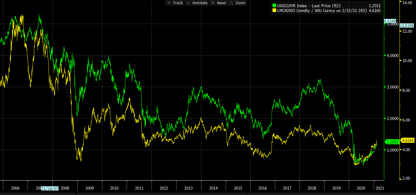 Yields increase along with the copper - gold ratio. Assuming a scale of rebound similar to that in 2009, to the level of 6, the10Y would reach “only” 2%. Assuming the gold price is around $ 1,800-2,000, the copper price should be in the range of $ 10,800-12,000 per ton. Source: Bloomberg
