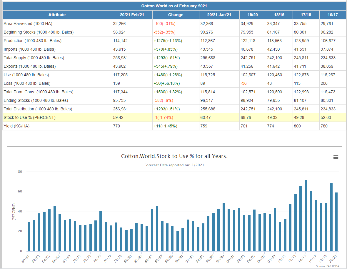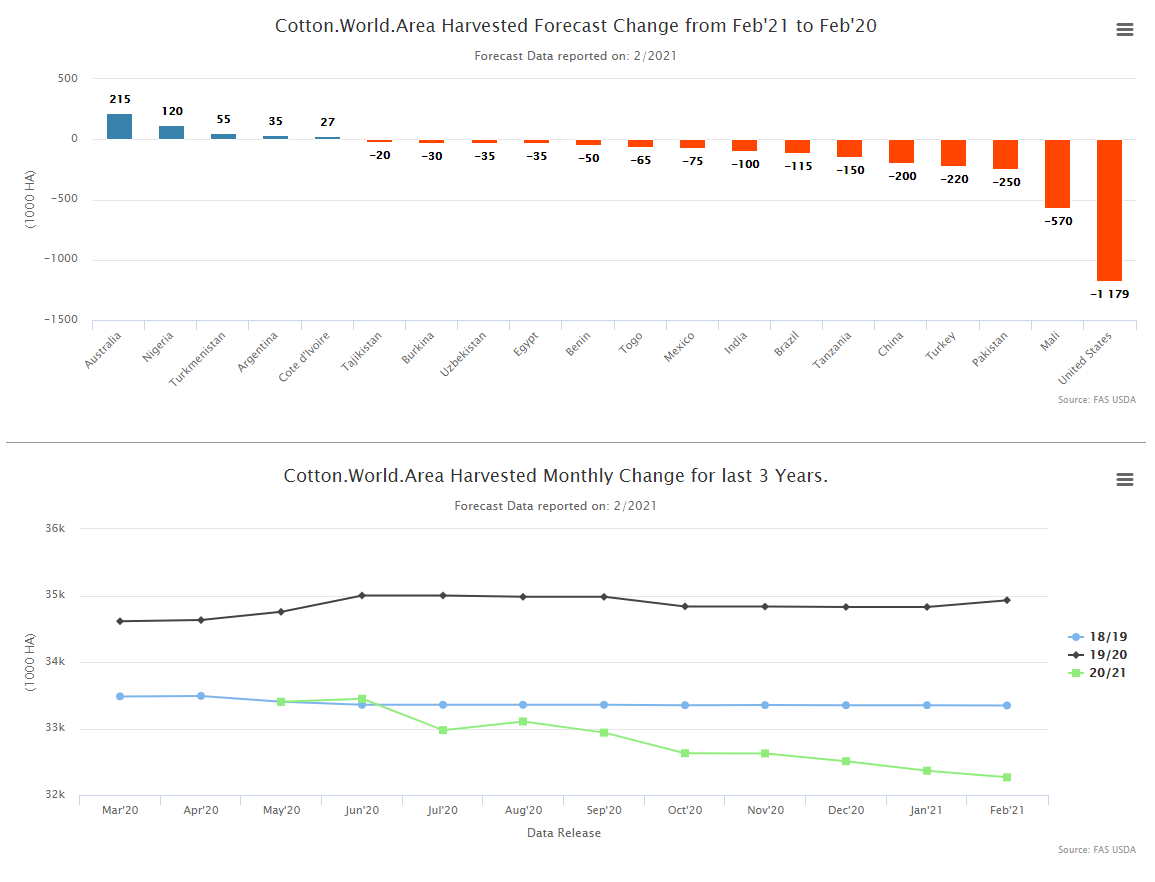 - USDA is successively lowering its outlook regarding cotton inventories levels around the world, especially in the United States due to the drastic decline in acreage