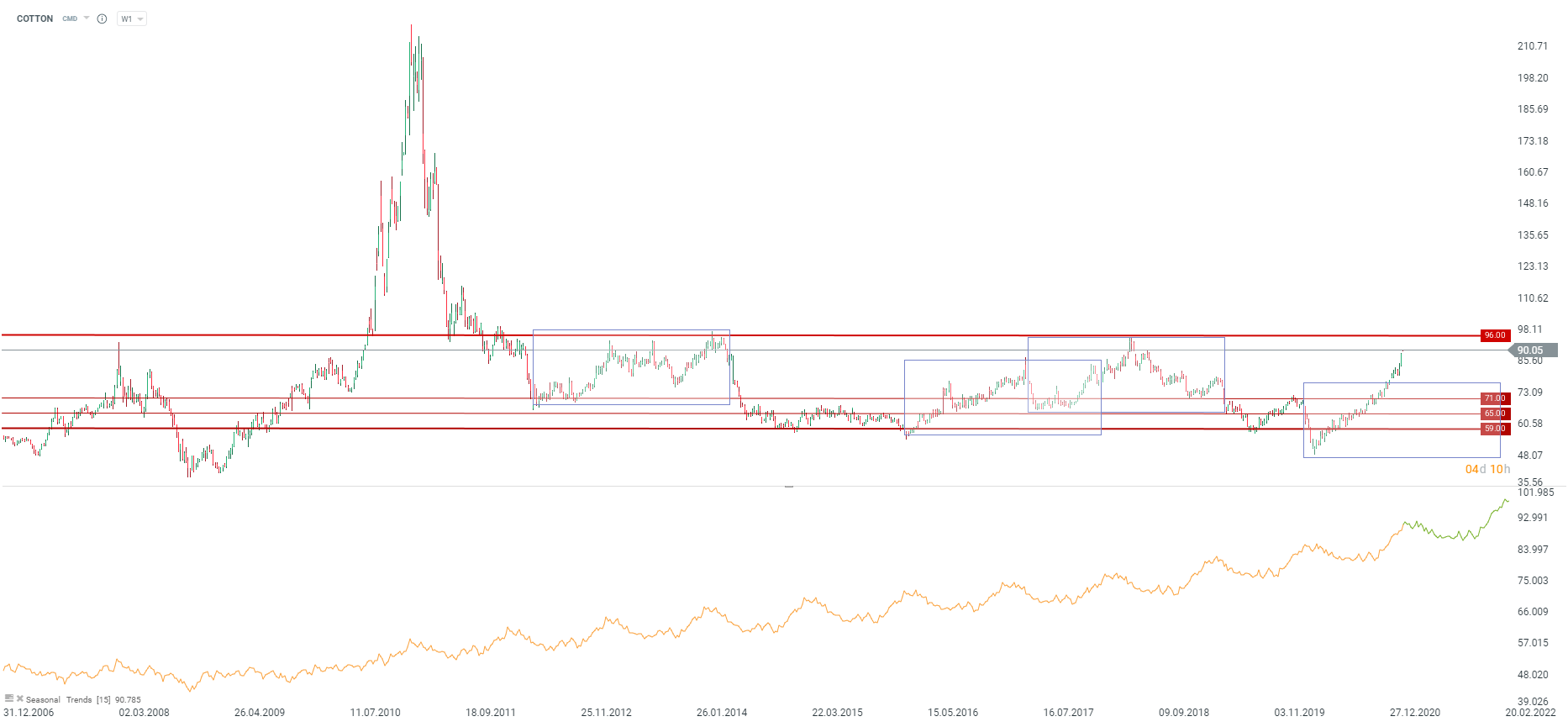 The price exceeded the range of upward waves observed within the last 8 years. On the other hand, taking the 2019 low as a basis, the price would not be much above the range. Nevertheless, the price is currently at the key resistance level of 96 cents per pound. Long-term seasonality indicates that the peaks should be reached in the coming weeks. Source: xStation5