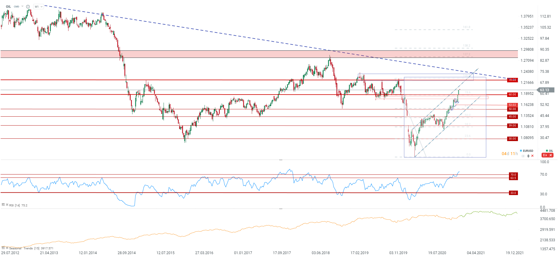 Brent crude oil is still far from the long-term downtrend that was drawn on the basis of the 2008, 2012, 2013, 2014 and 2018 highs. It may act as a certain "demand destruction"barrier. As such, prices this year are likely to average below $ 70 per barrel, with a strong supply zone marked with 2019 and 2020 highs. Along the way, resistance and support levels will be determined by the limits of the ascending channel. The range of upward movement is determined by the first bullish wave from 2008-2010. The theoretical high should therefore take place in August, although it can be seen that production will increase in April-May. The seasonality indicates that we should experience a lot of consolidation from May, while the peak should appear in September. Source: xStation5