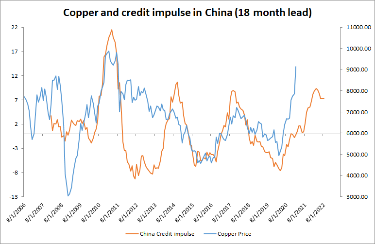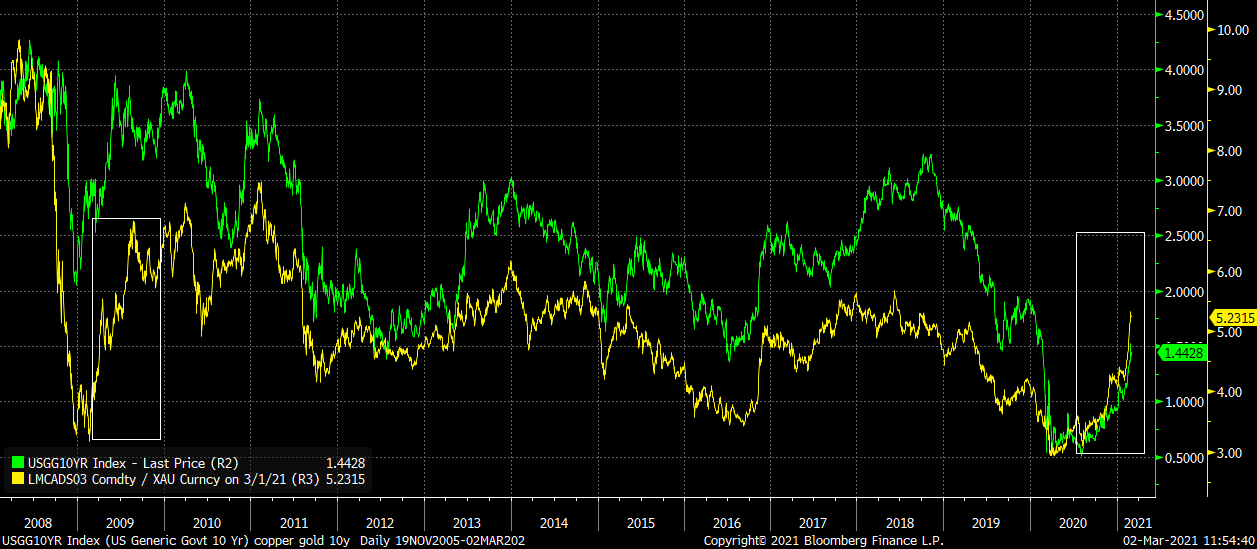Copper-to-gold ratio jumped above 5. Ratio sat slightly above 6.5 during a peak 2009 period. Continued rise could suggest continuation in the rise of US yields. On the other hand, an abrupt drop in US yields could be a risk for copper prices
