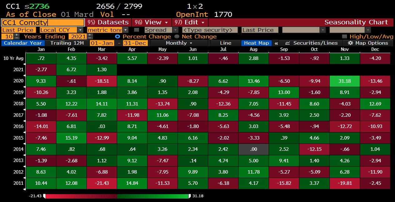 March has been a poor month for cocoa prices over the past 10 years. However, big declines from March last year (coronavirus pandemic) distort the average