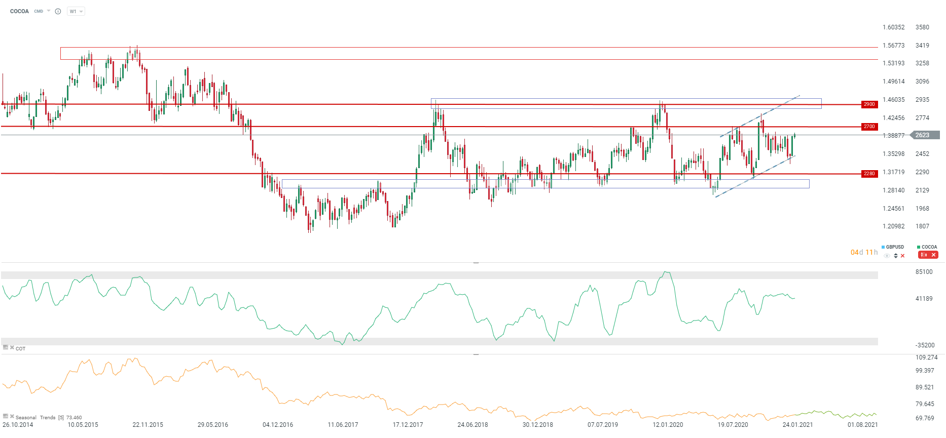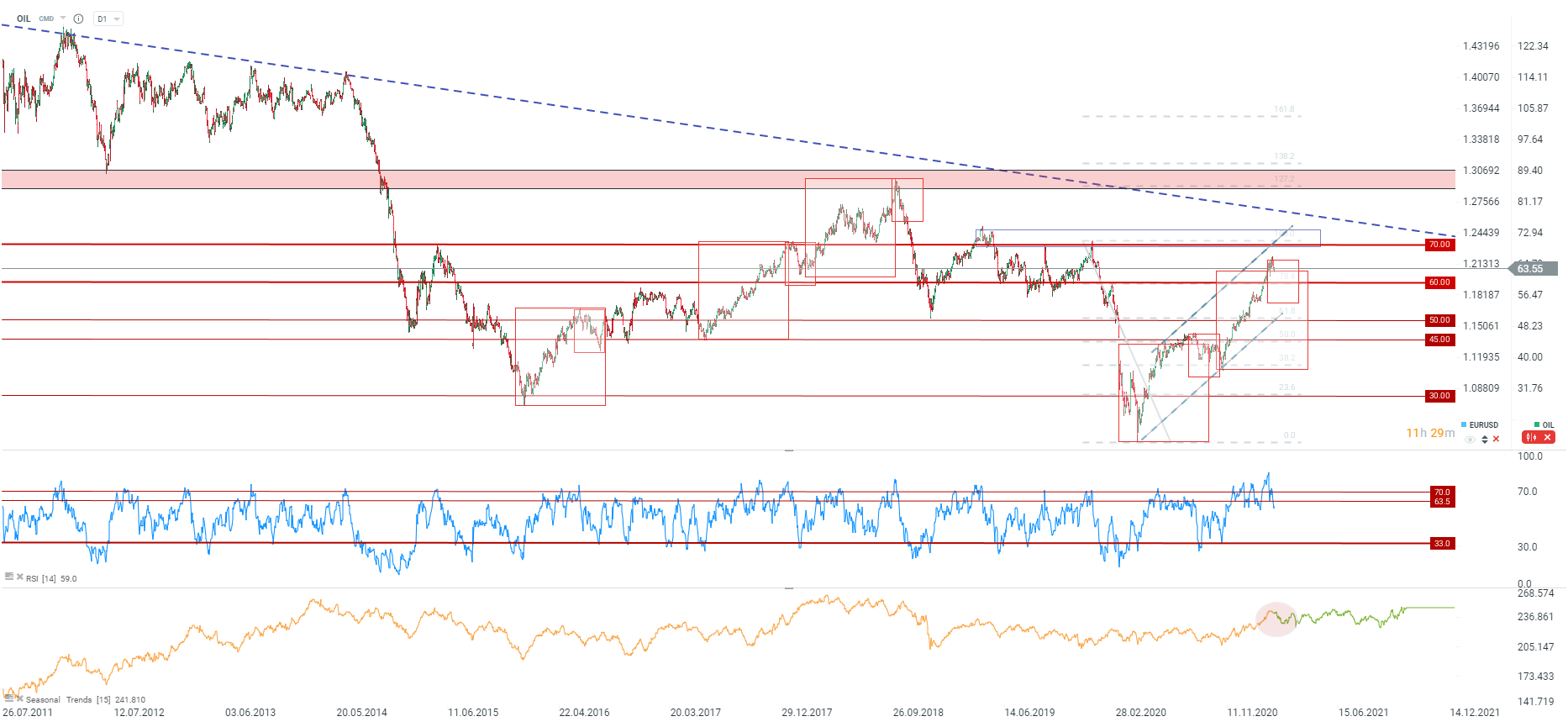 There were 3 upward waves during the 2016-2018 boom on the oil market. Each was $25 on average and was followed by $10-12 decline. Situation continued until a large price decline in 2018. First upward impulse from 2020 was very similar to this pattern. Current seasonal patterns hint at a possible pull back towards $55 area. Upper limit of the upward channel should act as a resistance. Q2 target remains price zone above $70 and the long-term downward trendline. Source: xStation5