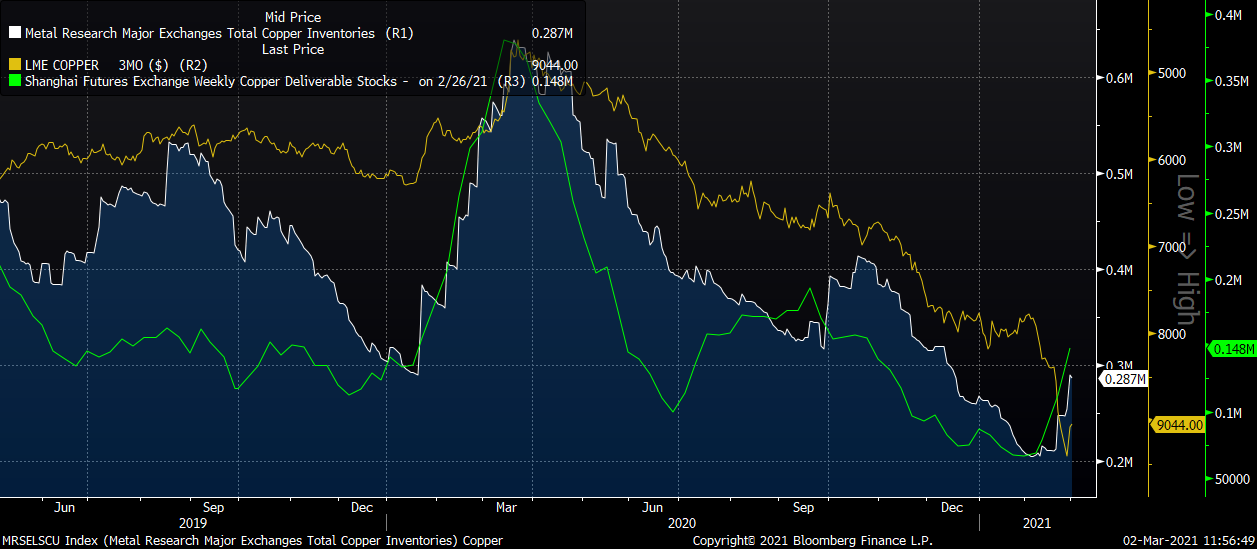 Copper inventories on global exchanges are rebounding, what may exert pressure on copper prices. Source: Bloomberg