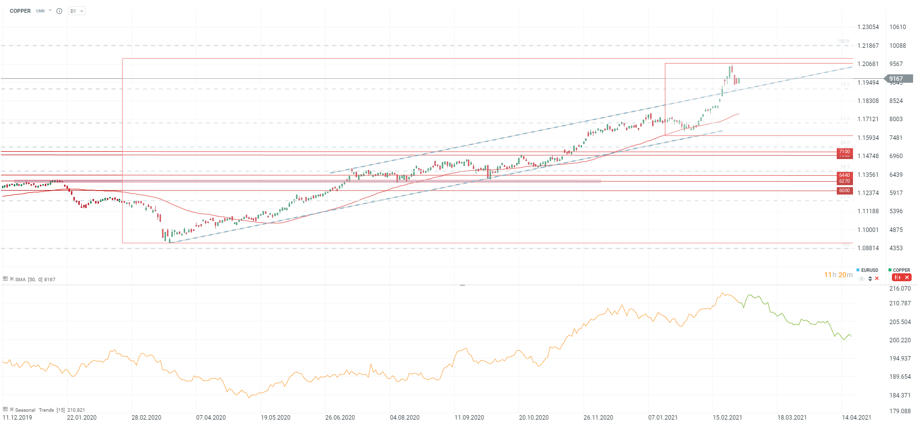 Comparing the current technical situation to 2009, we can see that a correction may be looming that could take the price to as low as $7,500 per tonne. Long-term seasonal patterns support this view. On the other hand, the 50-period moving average and lower limit of the upward channel should act as near-term support levels. Source: xStation5