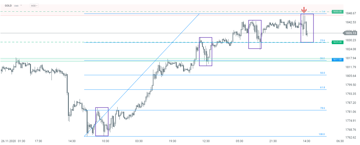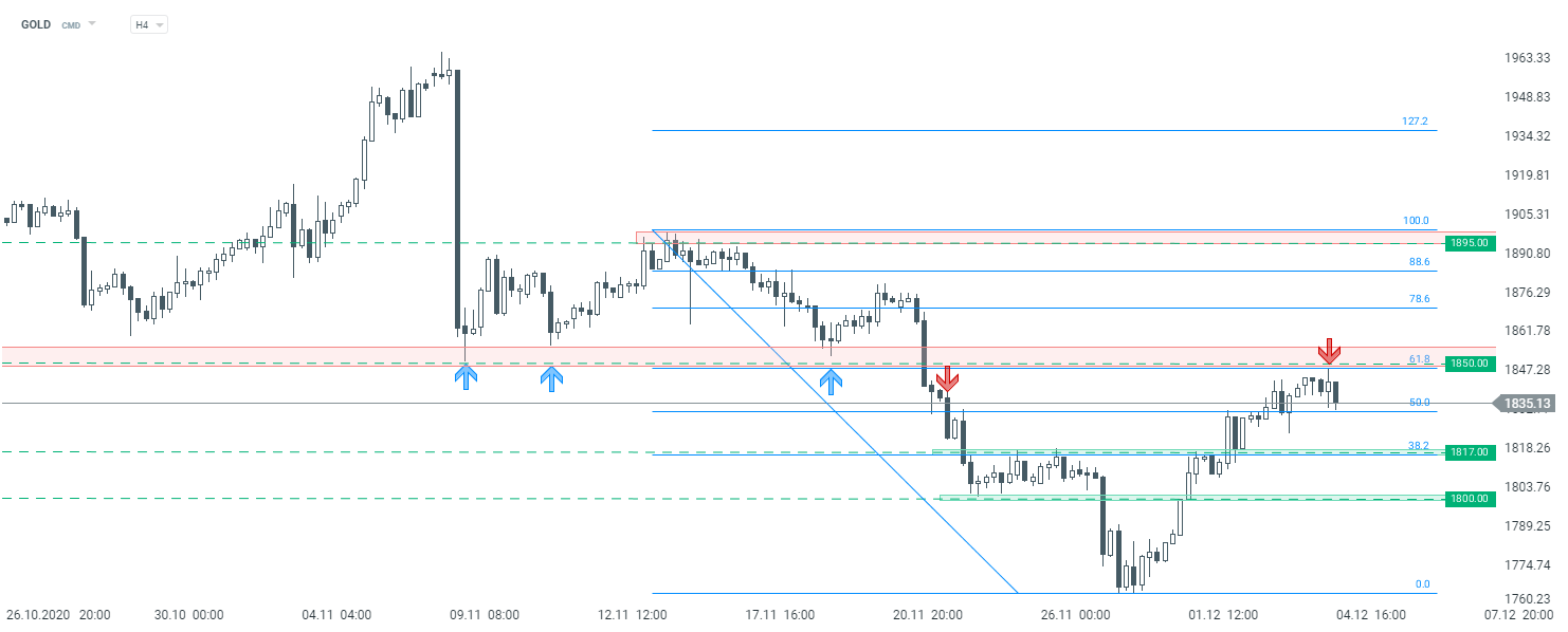 Az alacsonyabb időkeretet tekintve láthatjuk, hogy a felfelé irányuló trend folytatódik. Az Overbalance módszertana szerint az eladási jel akkor jelenik meg, ha a legnagyobb, lilával jelölt korrekciót elutasítják. Az 1829 dolláros szint alá való törés, amelyet a 23,6%-os Fibonacci retracement tovább erősít, utat nyit egy mélyebb csökkenés felé.