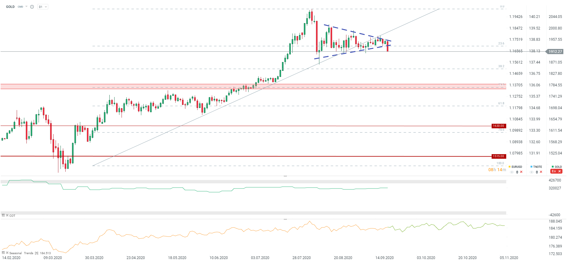Arany megpróbál kitörni a háromszög formációból. A potenciális sell-off elérheti az 1800 dollárt. Forrás: xStation5