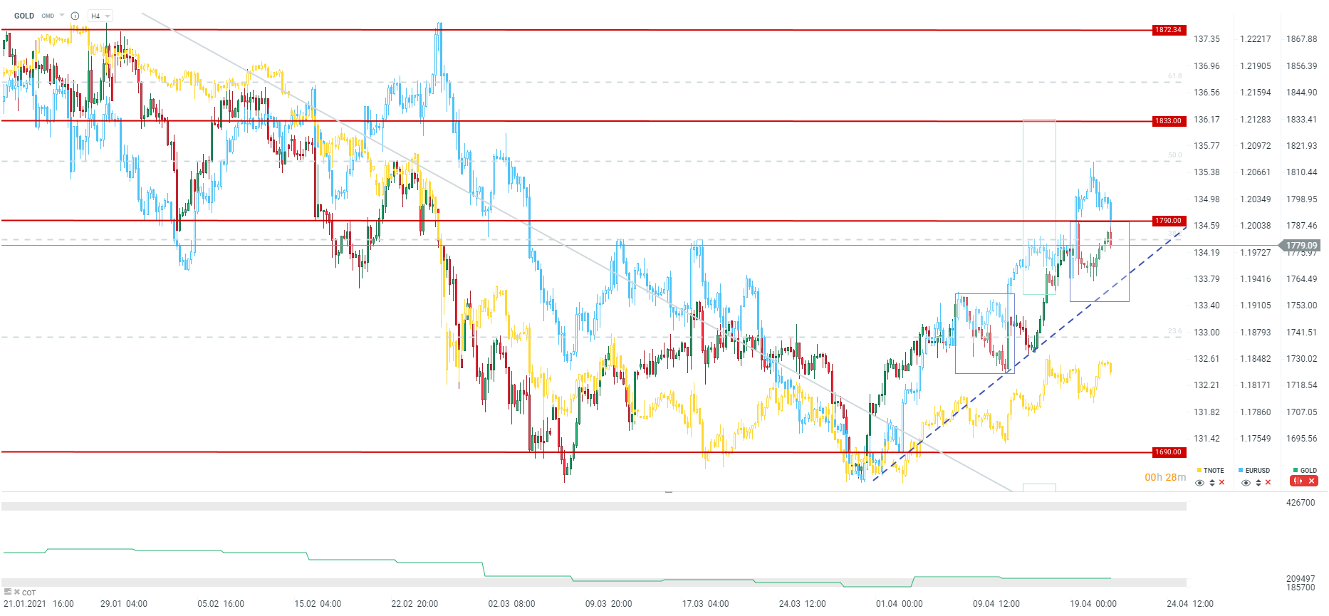 Gold once again retreats from the area of very important resistance, which is $ 1,790 per ounce. This is the zone associated with the local low from early February and the 38.2 Fibonacci retracement of the entire downward move from the current year. Gold closed a slight divergence with the EURUSD pair and reacted clearly to the decline in TNOTE (increase in bond yields).