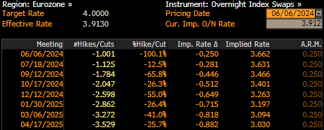 Azt mondtuk, hogy az EKB-ról széles körben kamatcsökkentést várnak, de lehet, hogy ez még alábecsülés – szinte mindenki úgy gondolja, hogy kamatcsökkentés következik! A Bloomberg által megkérdezett 62 közgazdász közül 60-an 25 bázispontos kamatcsökkentést várnak mára, míg egy még nagyobb, 50 bázispontos lépésre számít. A felmérésben mindössze egyetlen közgazdász számít arra, hogy az EKB változatlanul hagyja a kamatokat. A pénzpiacok biztosak abban, hogy az EKB ma kamatcsökkentésről dönt - a swappiac 100%-os eséllyel árazza be a mai 25 bázispontos kamatcsökkentést! Az azonban, hogy mi következik ezután, nem ennyire egyértelmű.