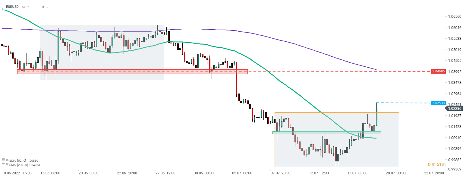 EURUSD jumped to 1.0250 as ECB rate hike odds continue to mount. The pair reached a daily high near 1.0253 - the highest level since July 6, 2022. An important technical development to note is that EURUSD managed to break above the upper limit of the Overbalance structure, hinting that the downtrend may be about to end.