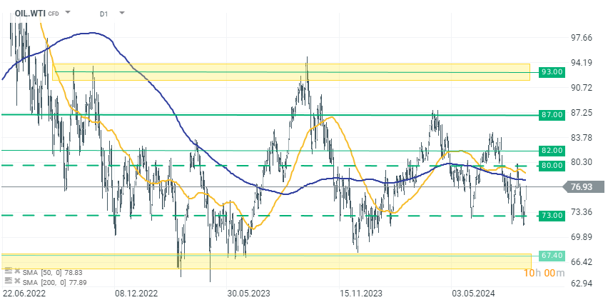 A WTI nyersolaj árfolyama gyorsan emelkedik, és a pénteki ülésen elért nyereséget tovább növeli. A hordónkénti 73 dollár körüli szintről való visszapattanás a hordónkénti 77 dollár körüli szintekre vitte az árat. Ha a közel-keleti konfliktus eszkalálódása folytatódik, és a líbiai helyzet nem nyugszik, a 80 dolláros szintek tesztelése a jelenlegi felfelé irányuló mozgás hatósugarán belül van.