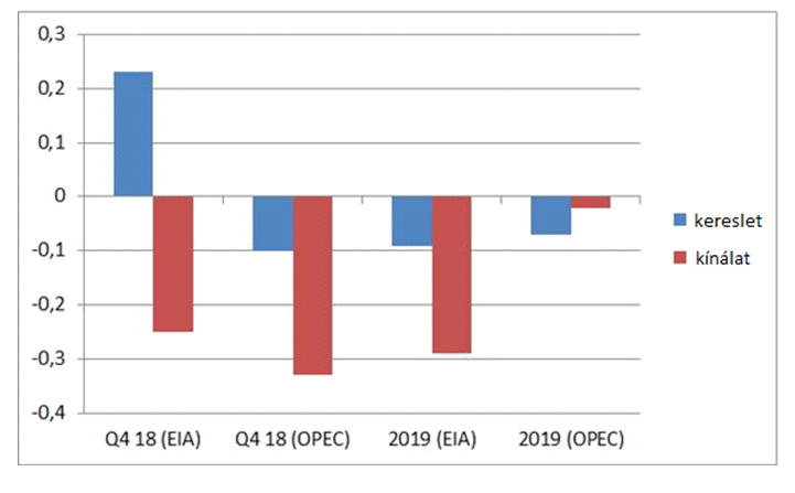 Változások a globális kereslet és kínálat becslése szeptember és augusztus között az EIA és az OPEC részéről a Q4 2018-nak és a 2019-nek