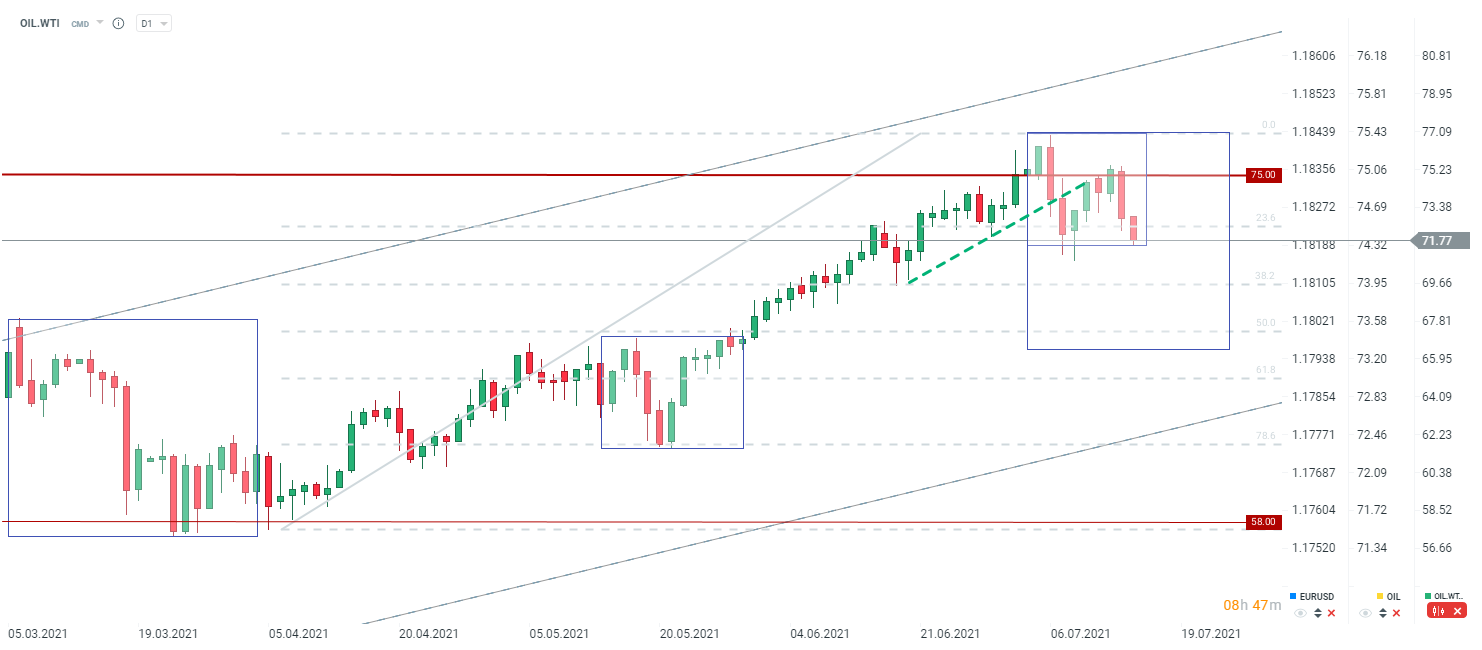 During today's session we can observe mixed sentiment in the oil market. On the one hand, we had speculation about a potential agreement between Saudi Arabia and the UAE, which theoretically could be positive for oil. On the other hand, the DOE report, while showing a sizable drop in inventories, ultimately led to a sell-off. Additionally, the recent appreciation of the dollar weighs heavily on oil.