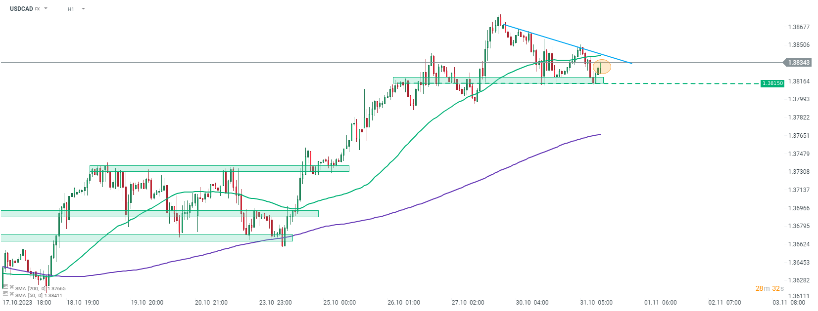 Az USDCAD a kanadai GDP közzététele után erősödött, és továbbra is a rövid távú trendvonal felé halad. Forrás: xStation5