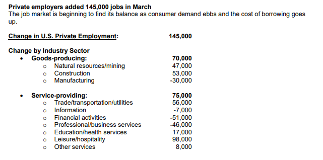 ADP US March goods-producing jobs rise by 70,000, and service-providing jobs rise by 75,000, As we can read in ADP analytical report, the March data suggest that the economy is slowing and the labor market is decelerating after a year of high expansion.