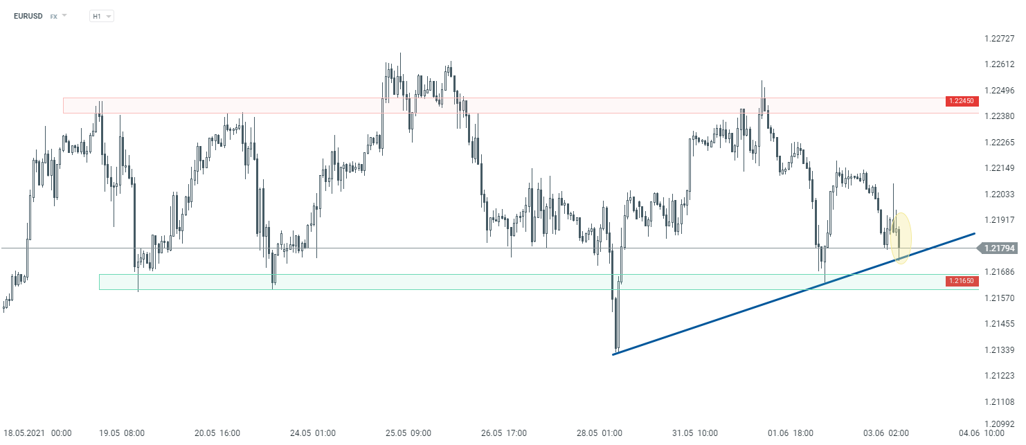 Az első lefelé irányuló mozgás ellenére az EURUSD az átfogó perspektívát tekintve az 1,2240-es ellenállás és az 1,2165-ös támasz között helyi oldalazó mozgásban kereskedik. Forrás: xStation5