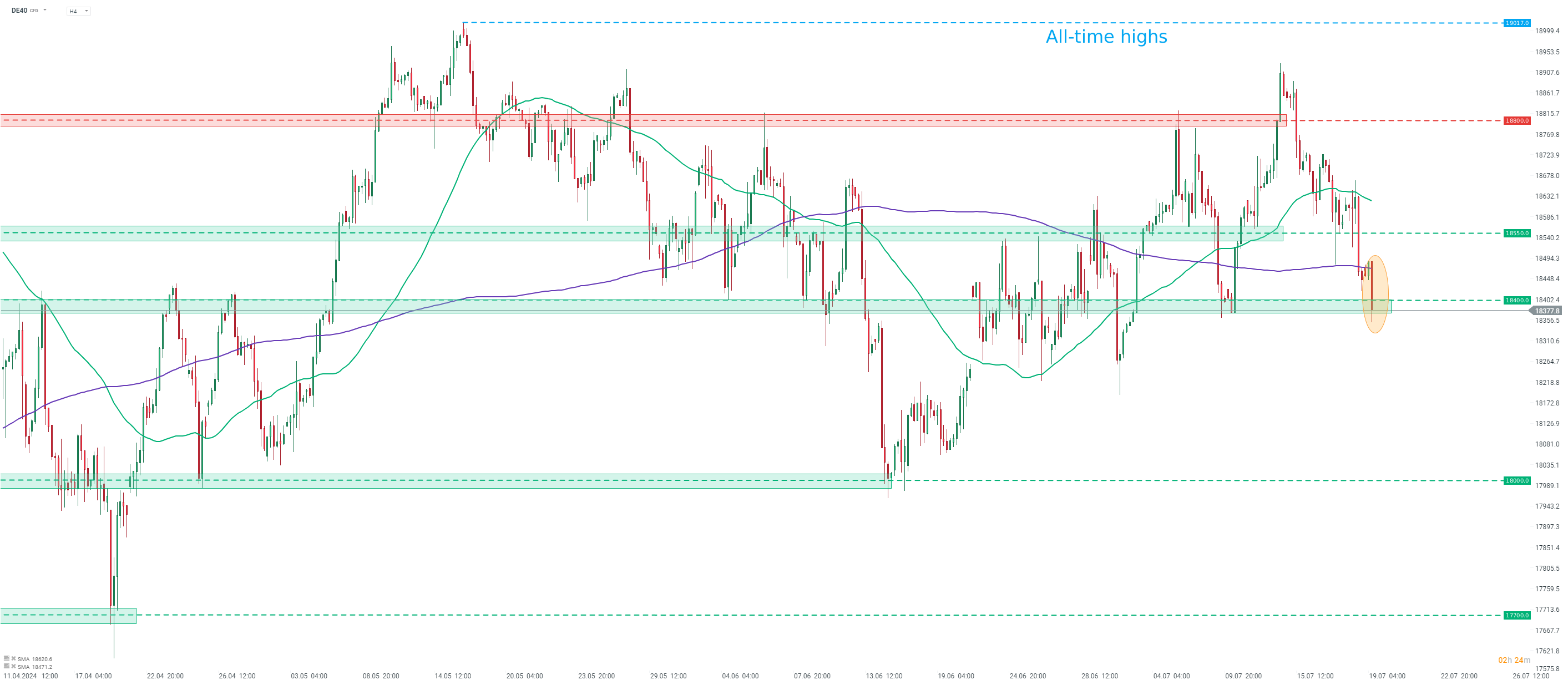 A DE40 elvesztette korábbi nyereségét, és jelenleg 0,4%-kal alacsonyabban kereskedik a nap folyamán. Az index a 18.400 pontos támasz zónát teszteli. Forrás: xStation5