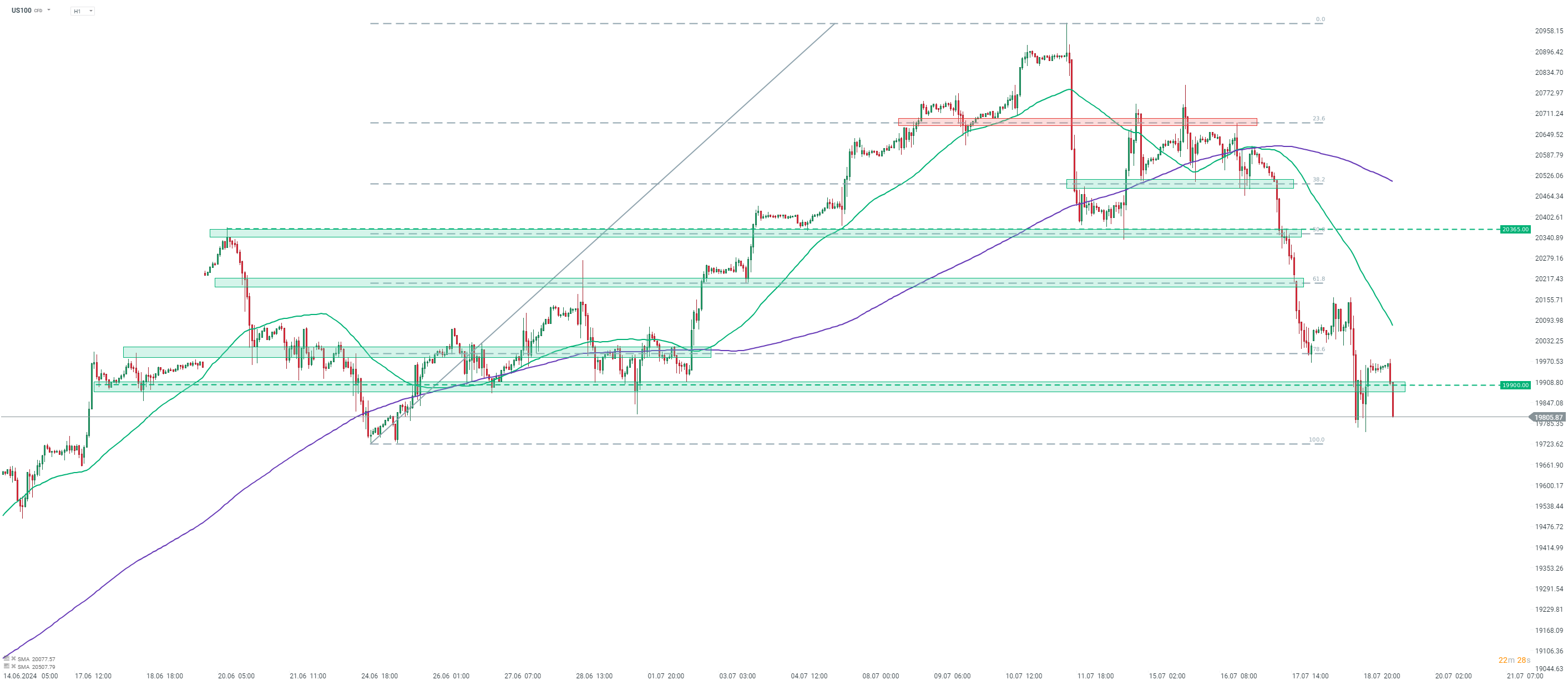 Az US100 ismét 19 900 pont alá zuhan a globális technológiai leállásokról szóló hírekre. Forrás: xStation5