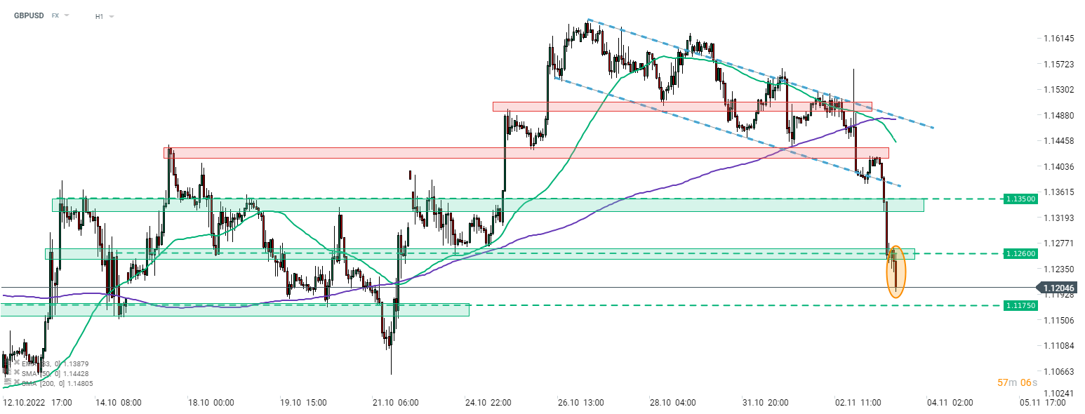 GBPUSD painted another leg lower in today's downward move following an in-line rate hike from BoE. Bank of England warned that should policy rates follow market path, a 2-year recession may occur. Source: xStation5