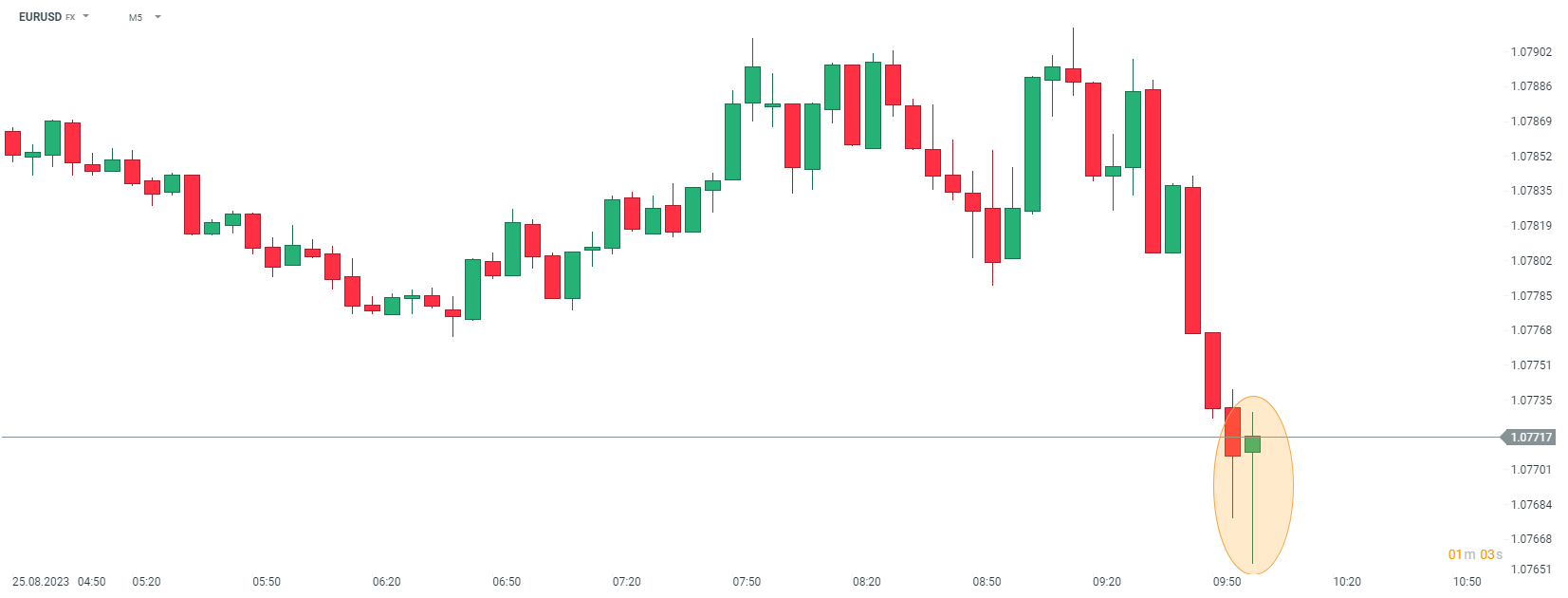 Az EUR már az adatok közzététele előtt esett, miután a jelentések szerint az EKB tagjai egyre inkább a kamatemelések szüneteltetését szorgalmazzák. A kiábrándító IFO-jelentés újabb eladási hullámot indított el, az EURUSD az 1,0770-es szint alá esett. A csökkenést azonban később sikerült visszaszerezni, és most a fő devizapár alig változott a közzététel előtti szintekhez képest. A német DE30 a közzétételt követően erősödött.
