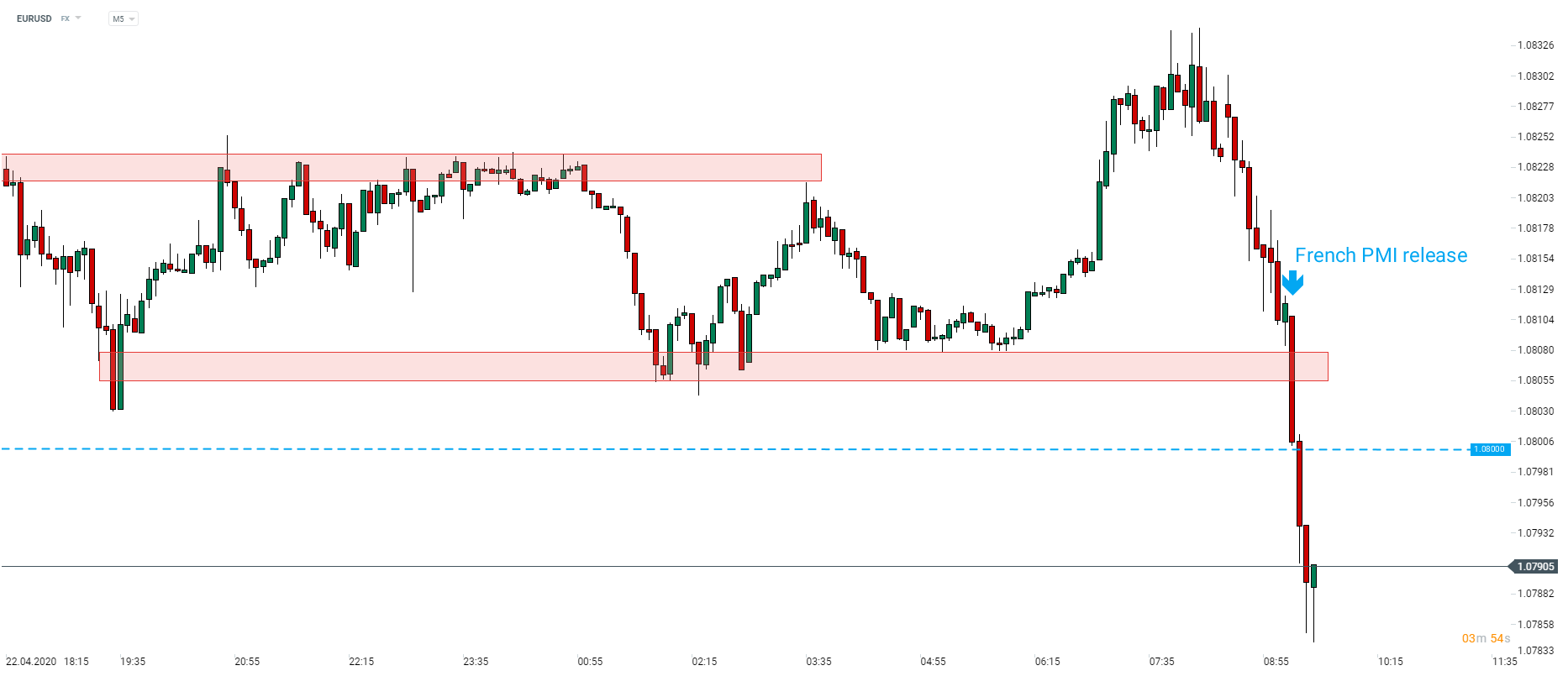 EURUSD dropped below 1.08 after disastrous services PMI from France. Source: xStation5