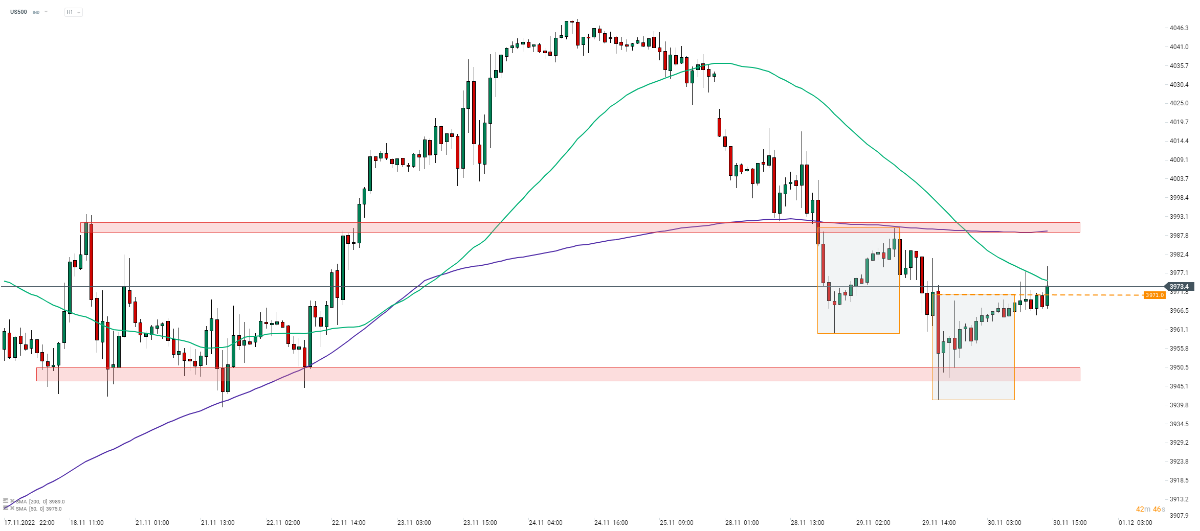 ADP employment report for November, final hint ahead of Friday's NFP release, was published at 1:15 pm GMT today. While the market expected US employment to increase by 200 thousand jobs, actual data turned out to be a downside surprise. Report showed an addition of just 127 thousand jobs, what is an increase two times lower than reported by NFP for October. However, as this hints that Fed may turn slightly dovish, equity markets are reacting positively to the data. US equity futures jumped to new daily highs with US500 making a break above local market geometry at 3,971 pts in a knee-jerk move. The 50-hour moving average was also tested but bulls failed to deliver a meaningful break above.