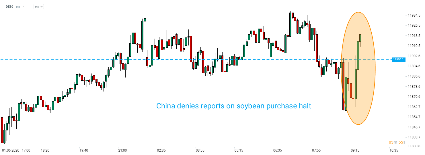 A kínai külügyminisztérium tagadta a szójabab vásárlásáról szóló sajtóközleményeket. Bloomberg arról számolt be, hogy az ország egyes amerikai mezőgazdasági termékek vásárlásait meg kívánja állítani. A jelentés a kérészéletű eladást váltotta ki a tegnapi európai ülésen. A DE30 és az US500 megugrott a friss hírre, a német index visszatáncolt 11 900 pont fölé.