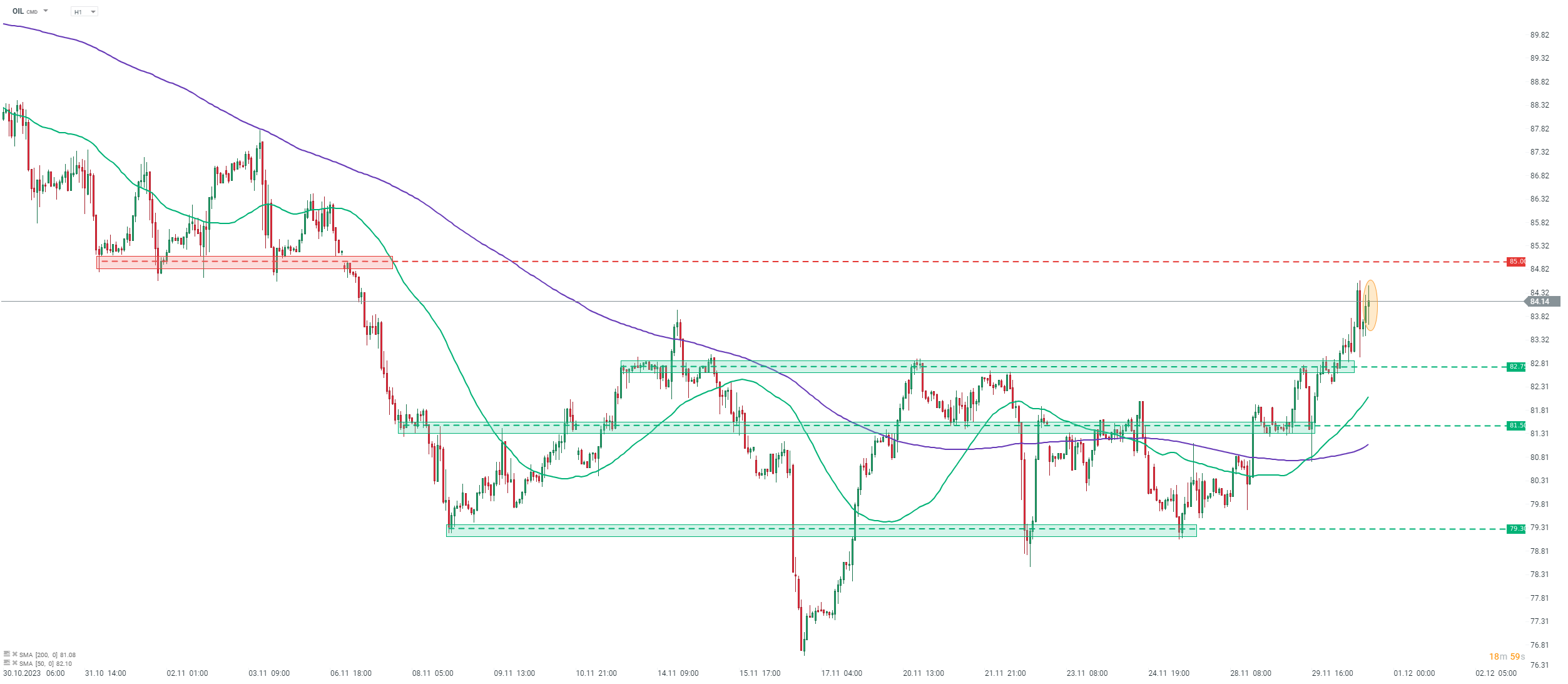 Oil moved higher on headlines saying that OPEC+ agreed on output cuts. Saudi Arabia will extend its voluntarily 1 million bpd output cut while OPEC+ will also make additional million bpd output cut on top of that. Such an outcome was strongly hinted by media reports yesterday and earlier today and therefore market reaction is fairly muted. Brent (OIL) jumped around 0.6% on the news and did not even manage to paint a fresh daily high. A big part of the move was erased already.