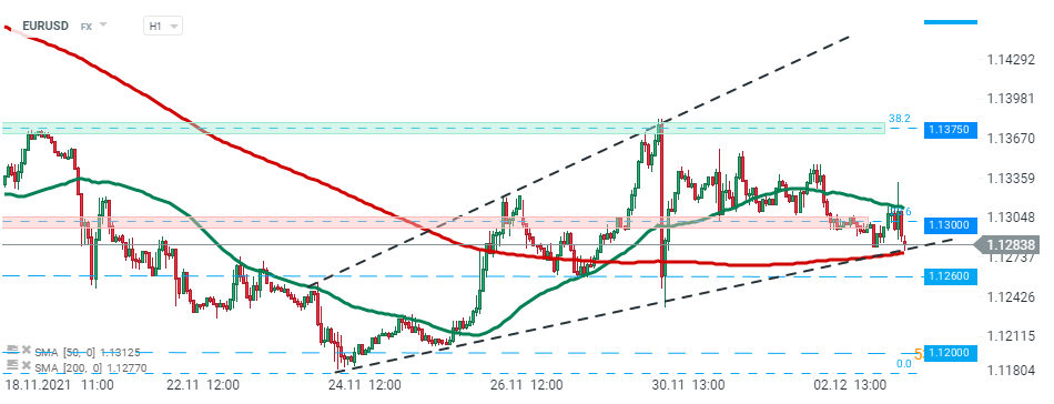 EURUSD pair fell after today's data release and is testing lower limit of the wedge formation and 200 SMA (red line). Should break lower occur, then support level at 1.1260 may be at risk. Source:xStation5